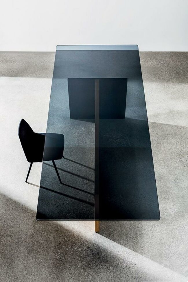 Slanted glass tables draw immediate attention with their unique angular shape.