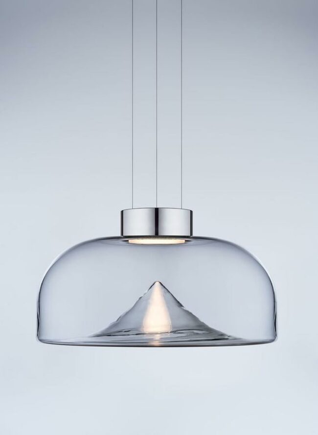 Beneath the transparent dome, a sculptural cone-shaped detail adds unexpected geometric intrigue to the design.