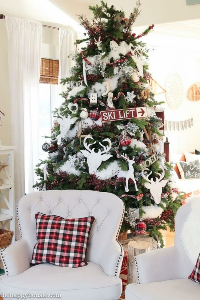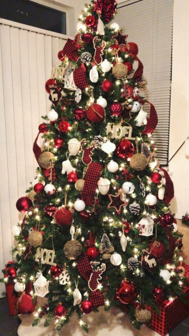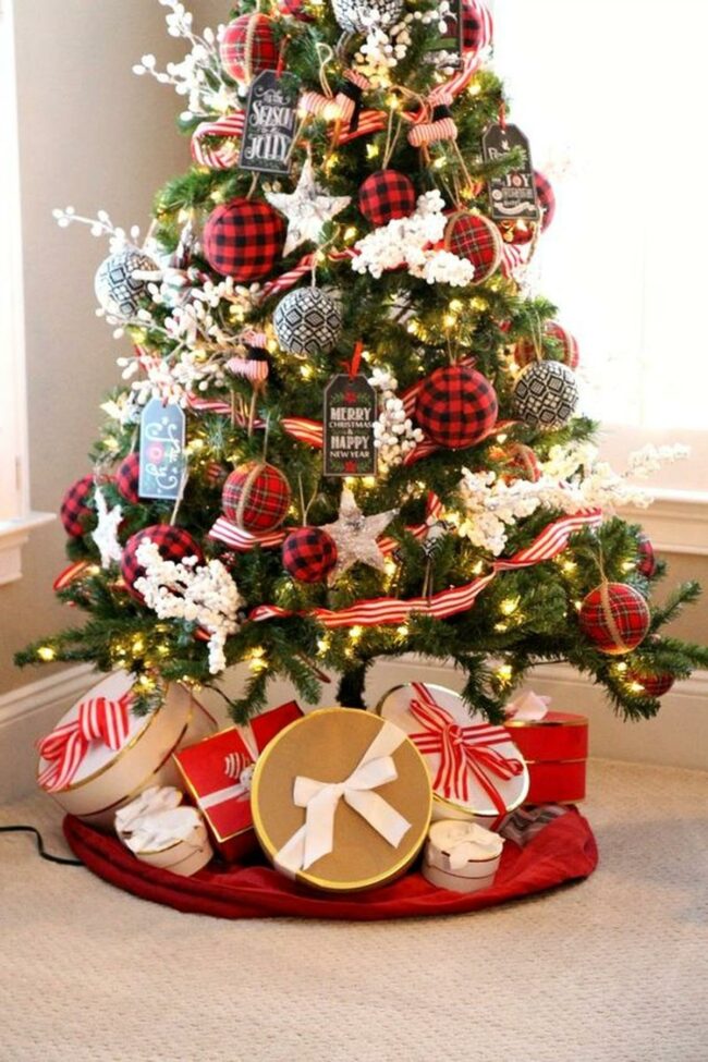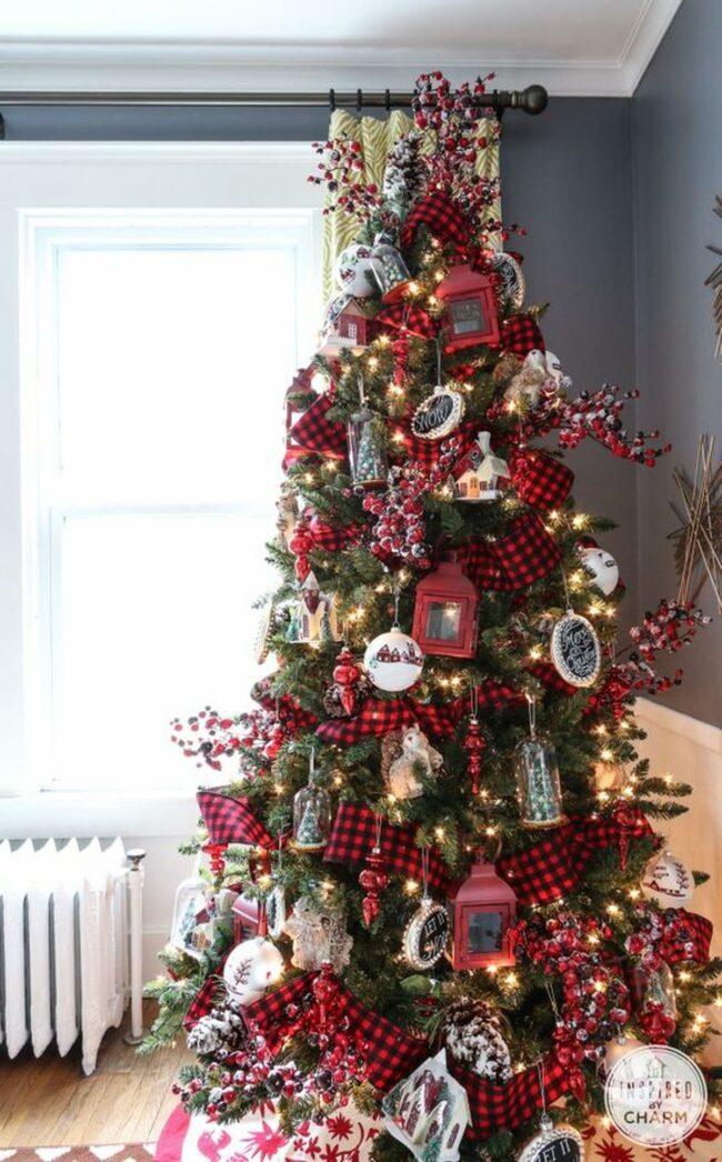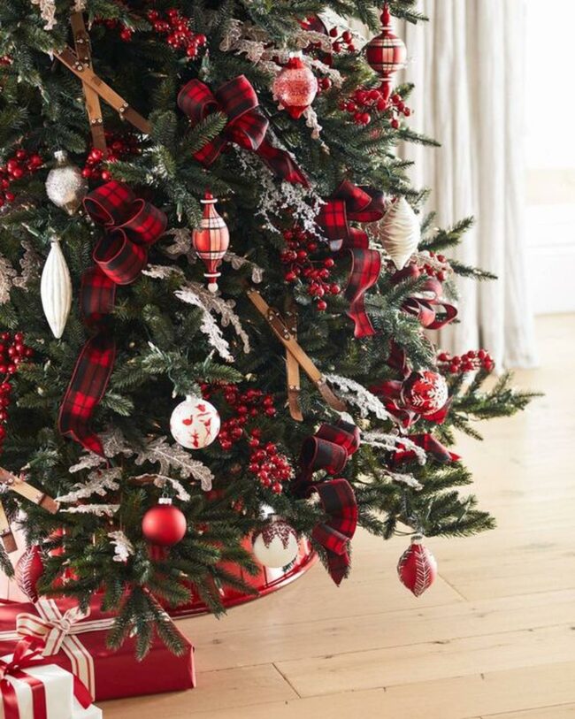 Christmas trees sparkle with festive charm and personality, showcasing a delightful mix of red and black plaid ornaments, white berries, and playful striped ribbons.