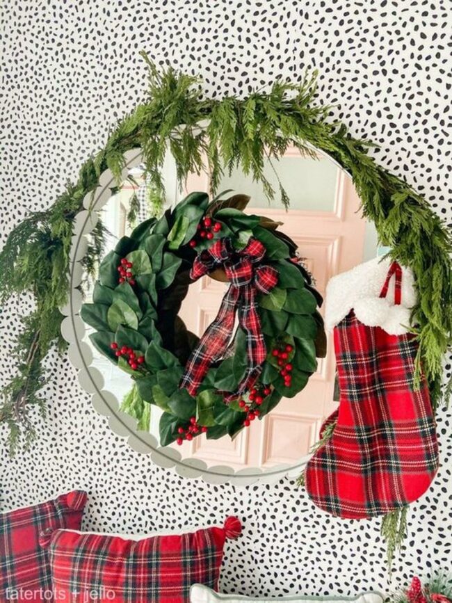Green pine garland frames a round mirror, adding natural elegance to the space.