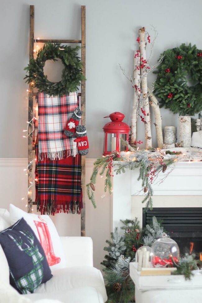 Wooden ladders draped with plaid blankets and mittens create an inviting atmosphere near sparkling fireplaces.
