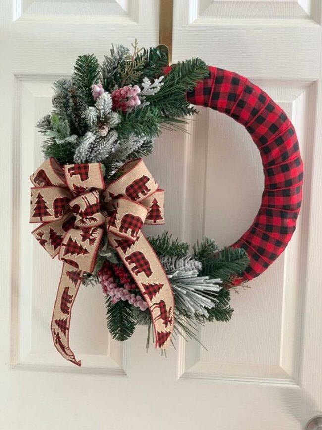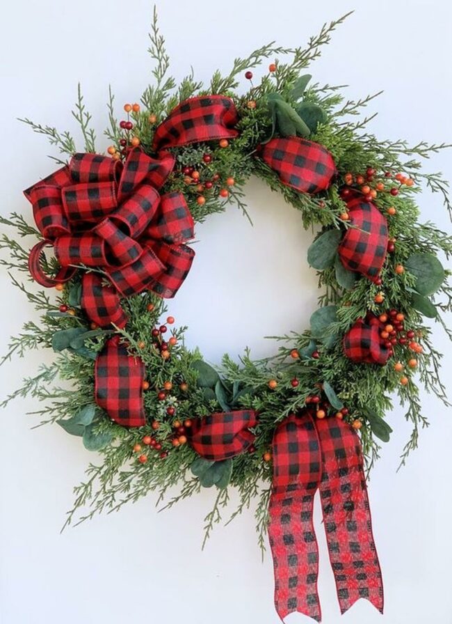 Red plaid ribbons wind through evergreen branches, adding classic charm to the scene.