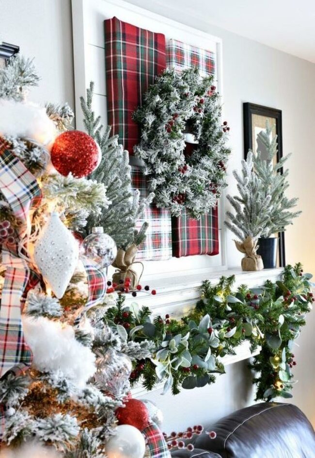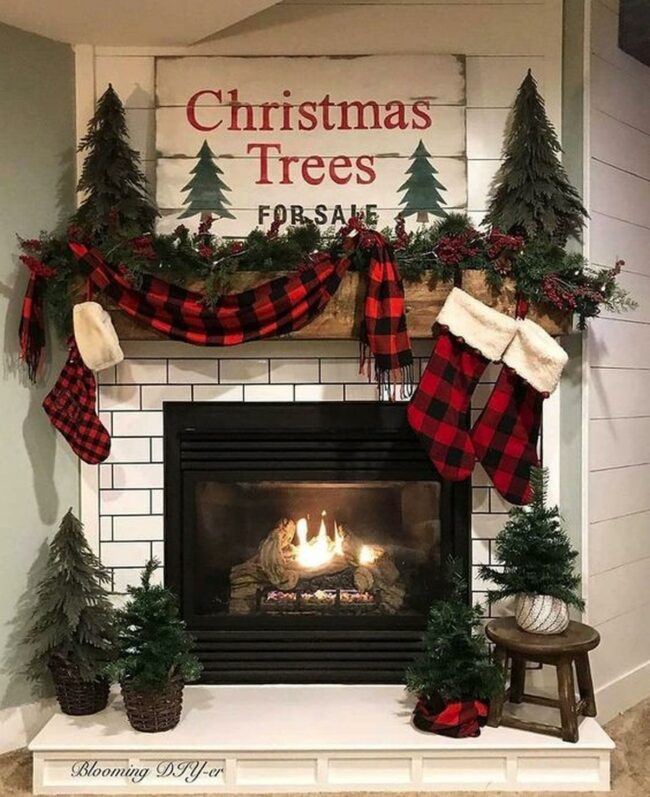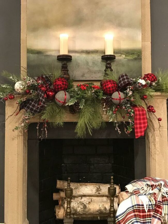 Red plaid decorations accent the mantel, complemented by green pine branches and shiny berries.