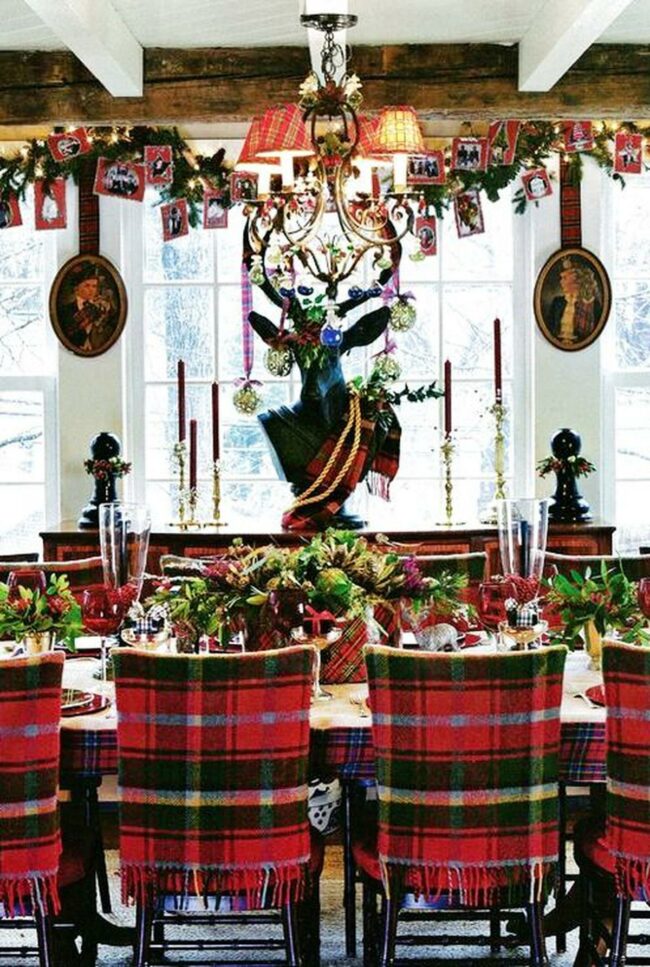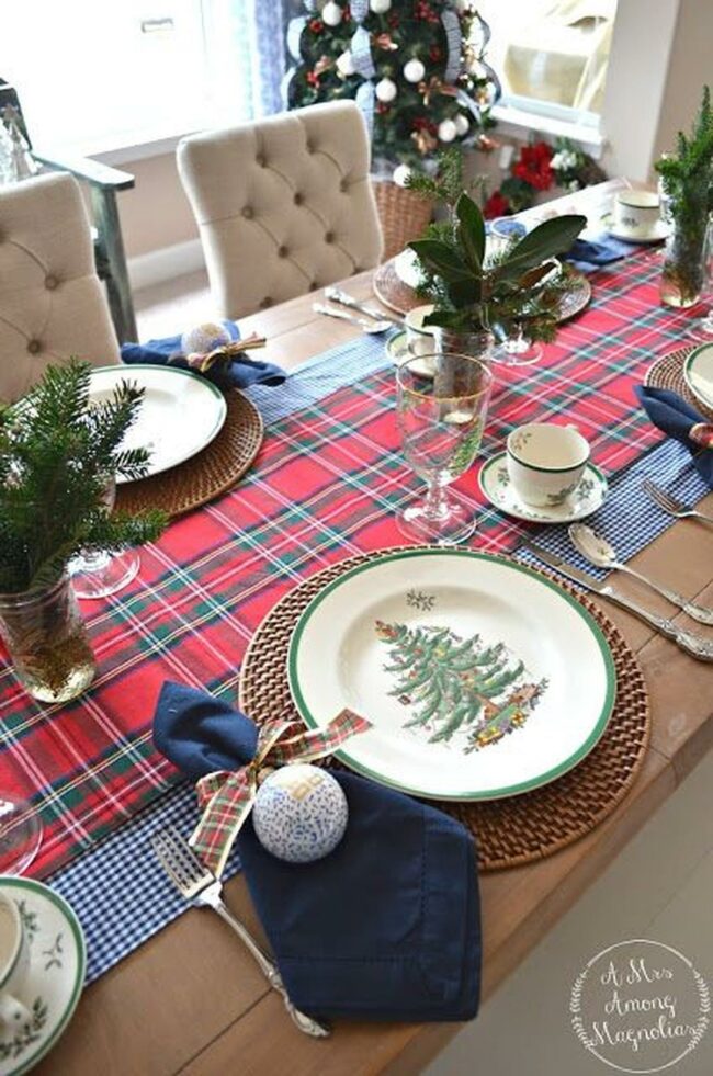 Red and green plaid runners drape across the dining surface, creating a welcoming holiday atmosphere.