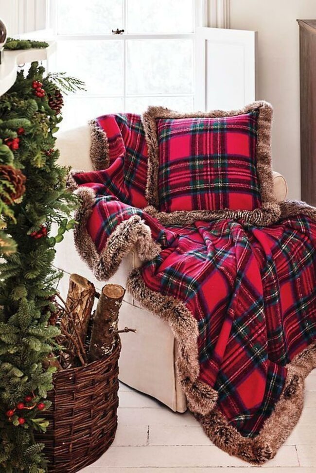 A white chair draped with a red and black plaid blanket adds rustic warmth to the scene.