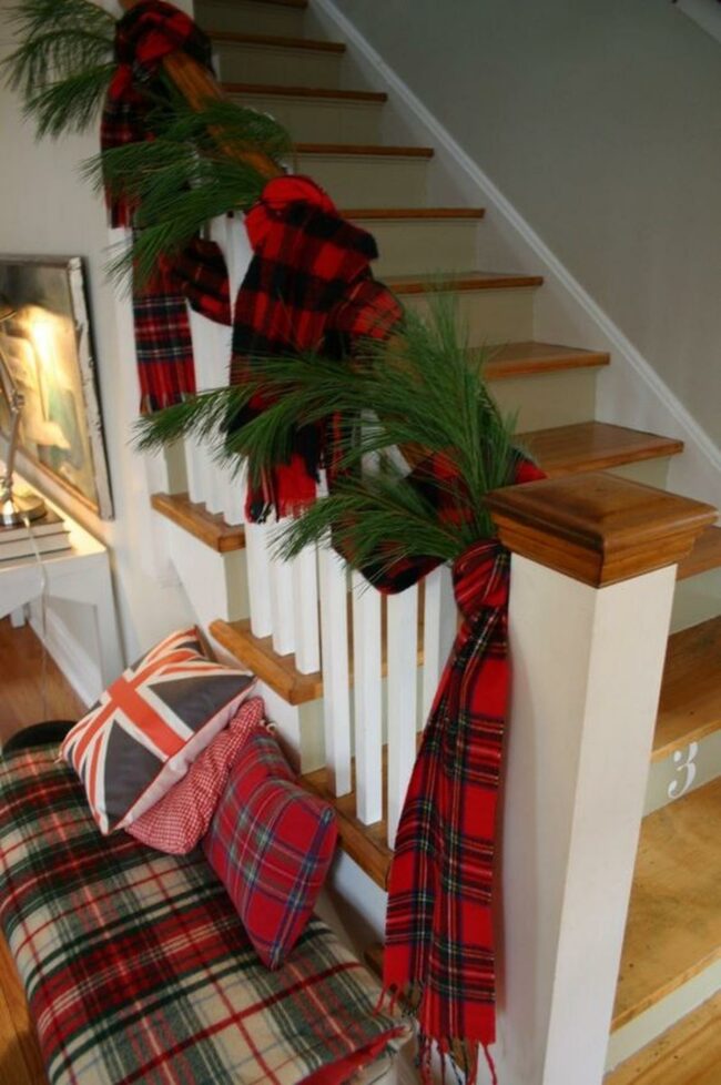 Red and black plaid scarves drape elegantly around the banister, intertwined with fresh green pine branches for a natural seasonal touch.