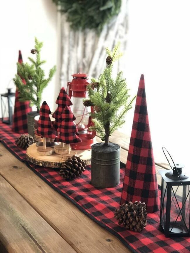 Checkered red and black fabric trees on wooden bases echo the classic runner draped across the table.