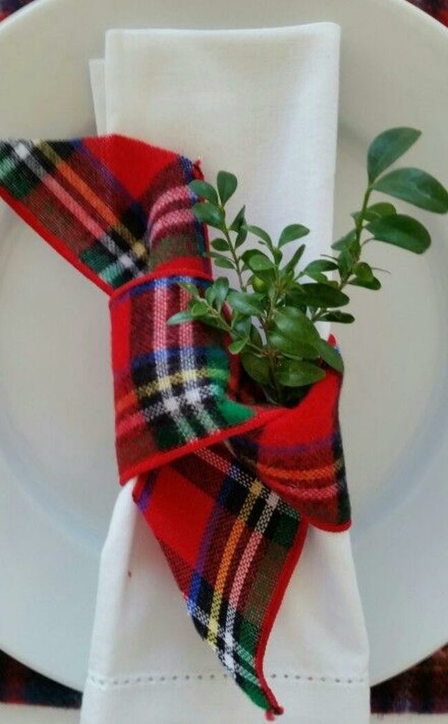 White plates paired with plaid wraps create an instant mood of comfort and tradition.