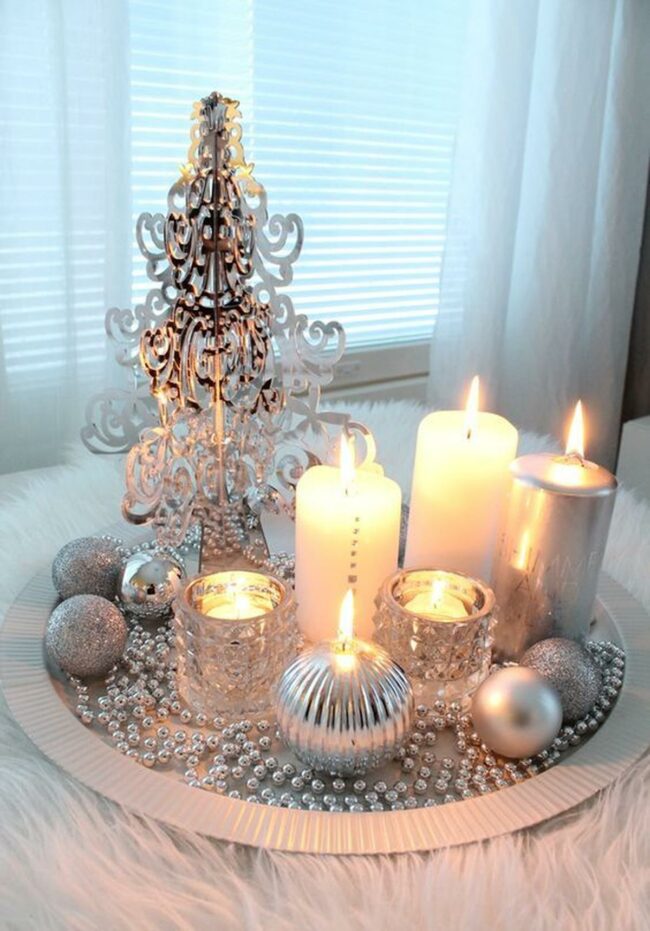 This elegant arrangement sparkles with festive charm, featuring three white candles glowing softly on a reflective silver tray.