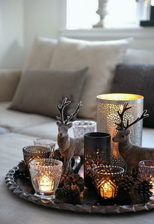 Nature-inspired accessories like pinecones, silver balls, and green pine branches surround a sparkling deer figure, bringing outdoor beauty inside.