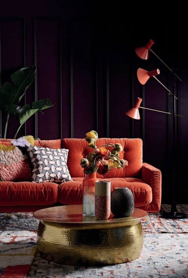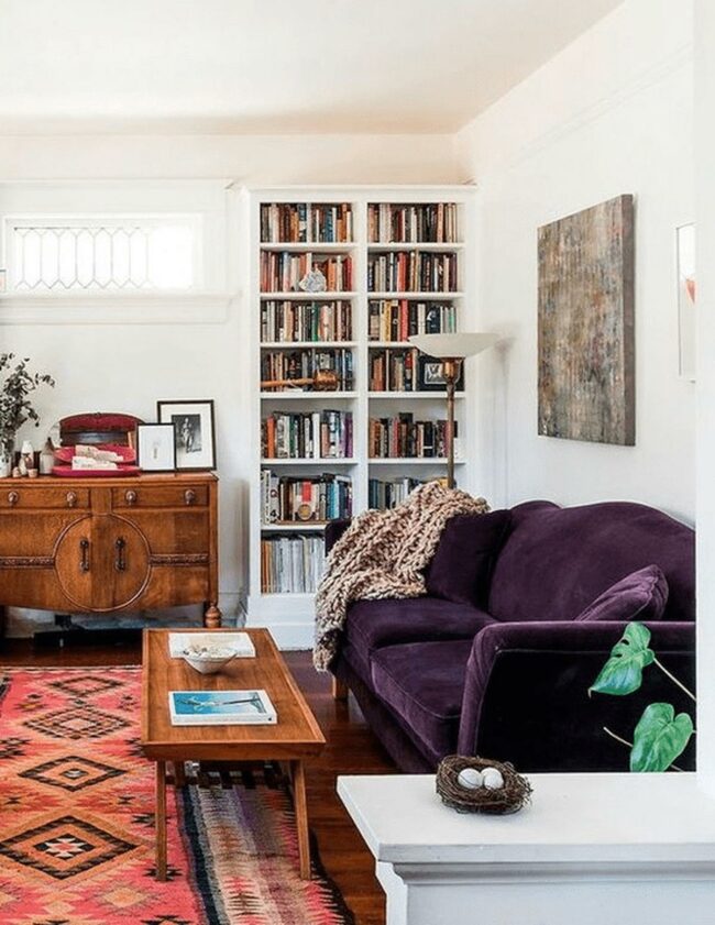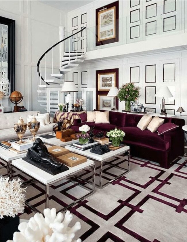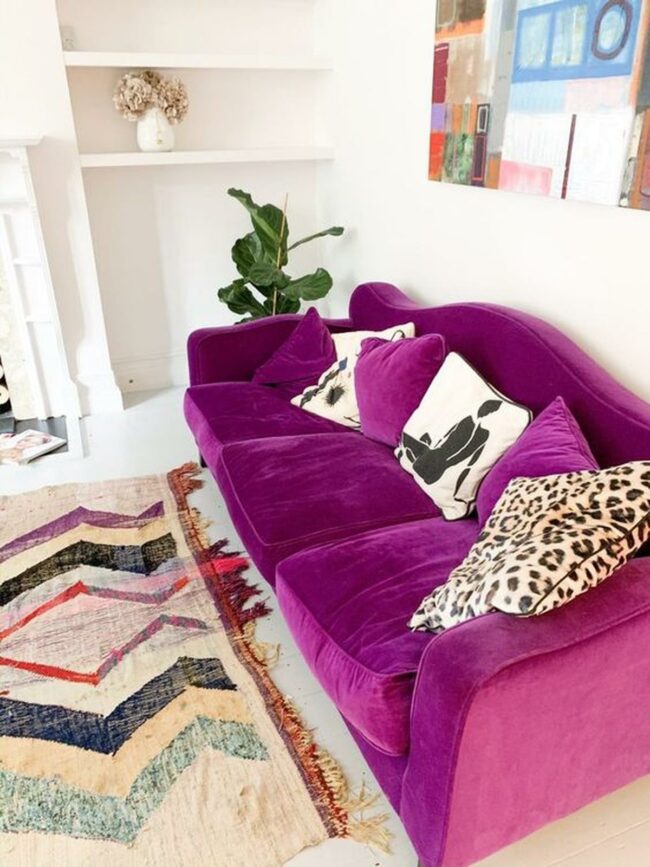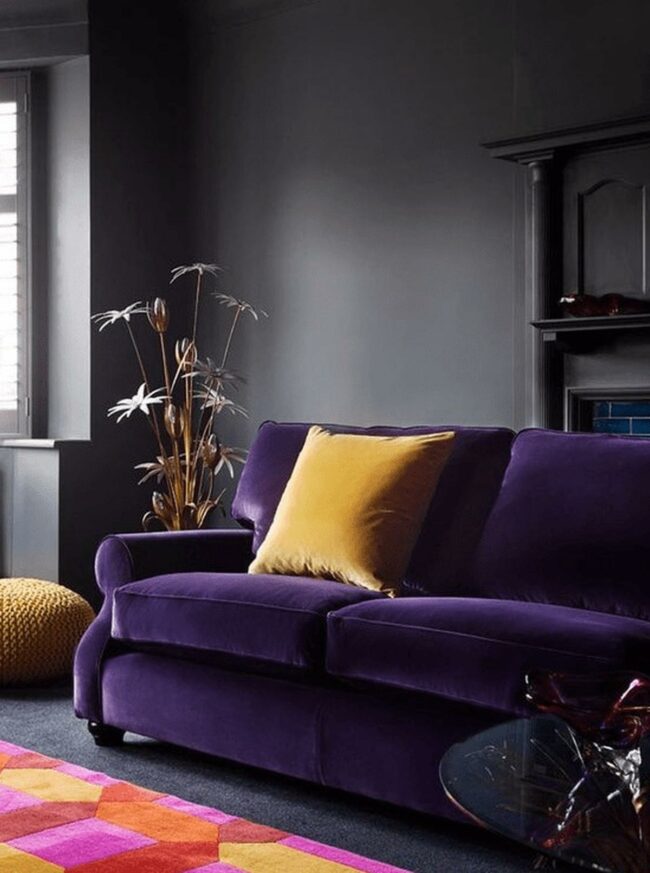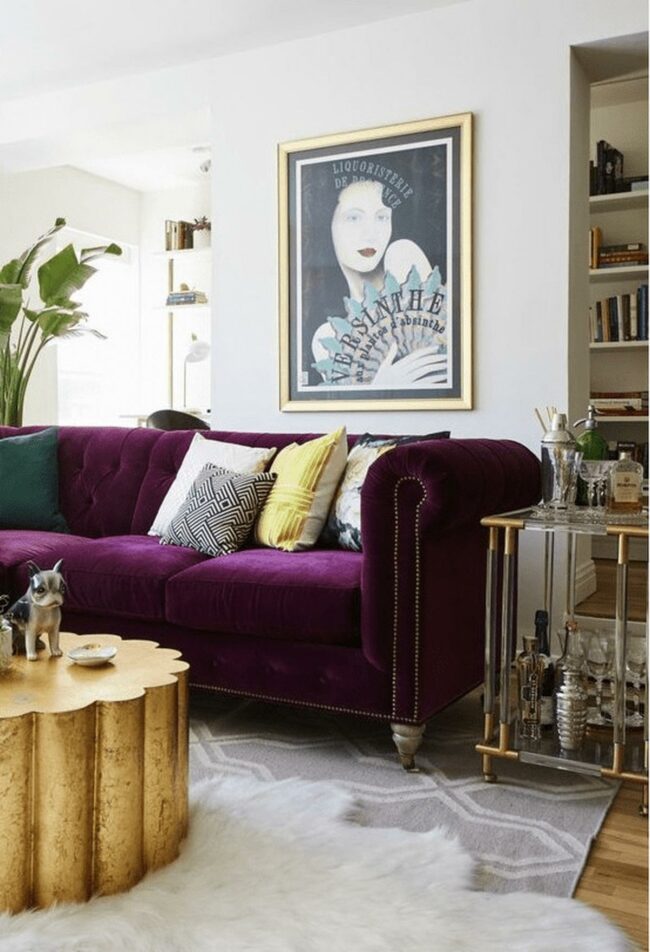 Living rooms with deep purple sofas are statement makers that transform neutral spaces into design masterpieces.
