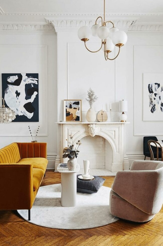 Living rooms with classic white walls and delicate molding are architectural canvases that showcase personal style.