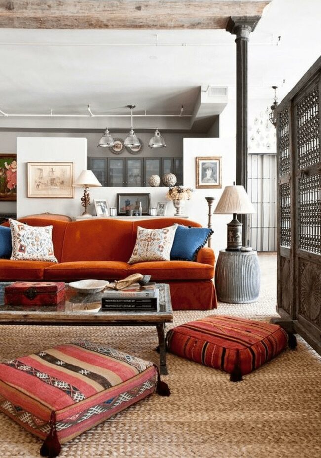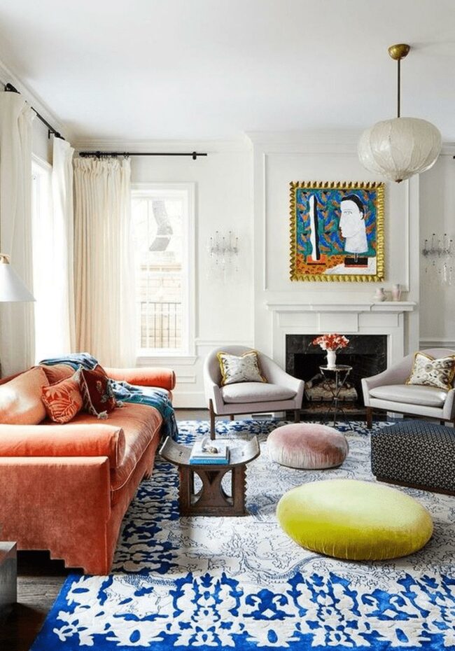 A colorful rug with orange tones anchors the room's dynamic energy.