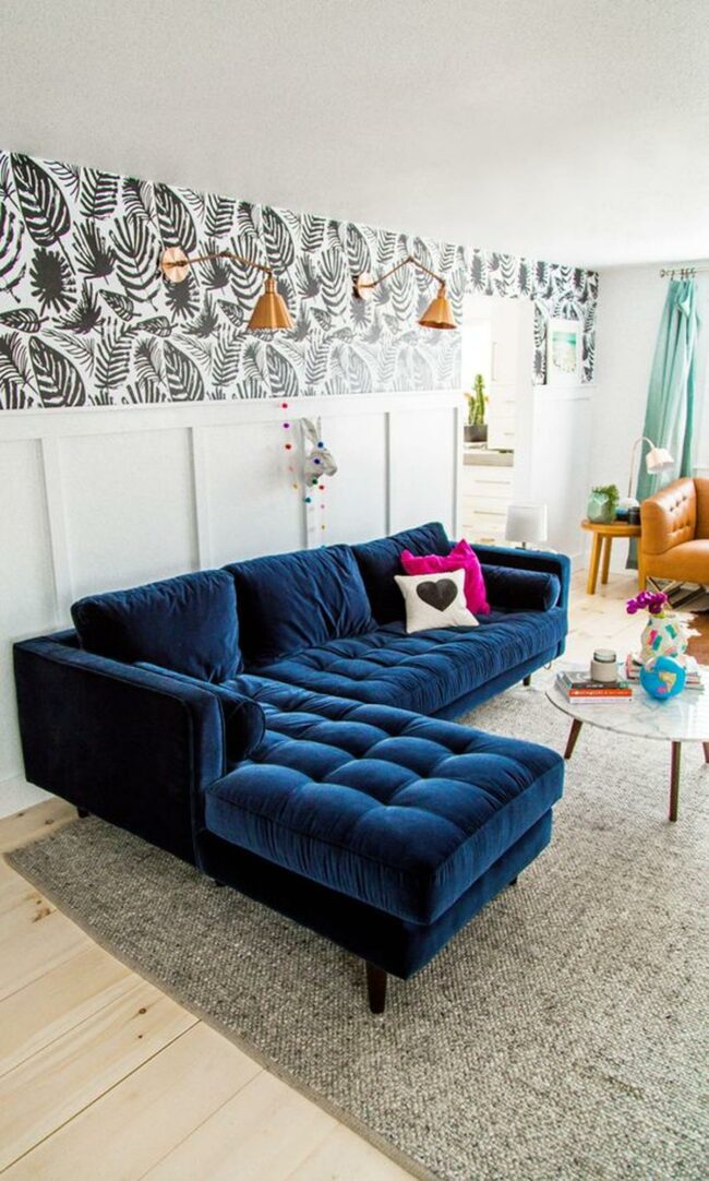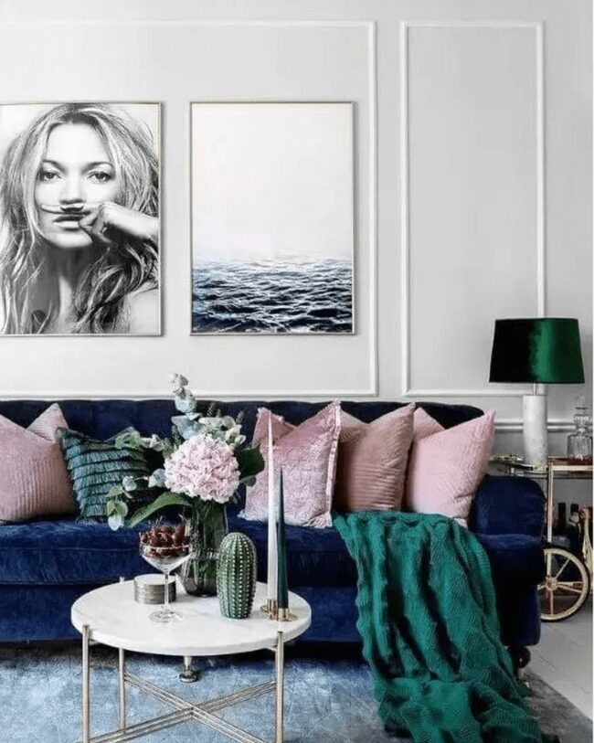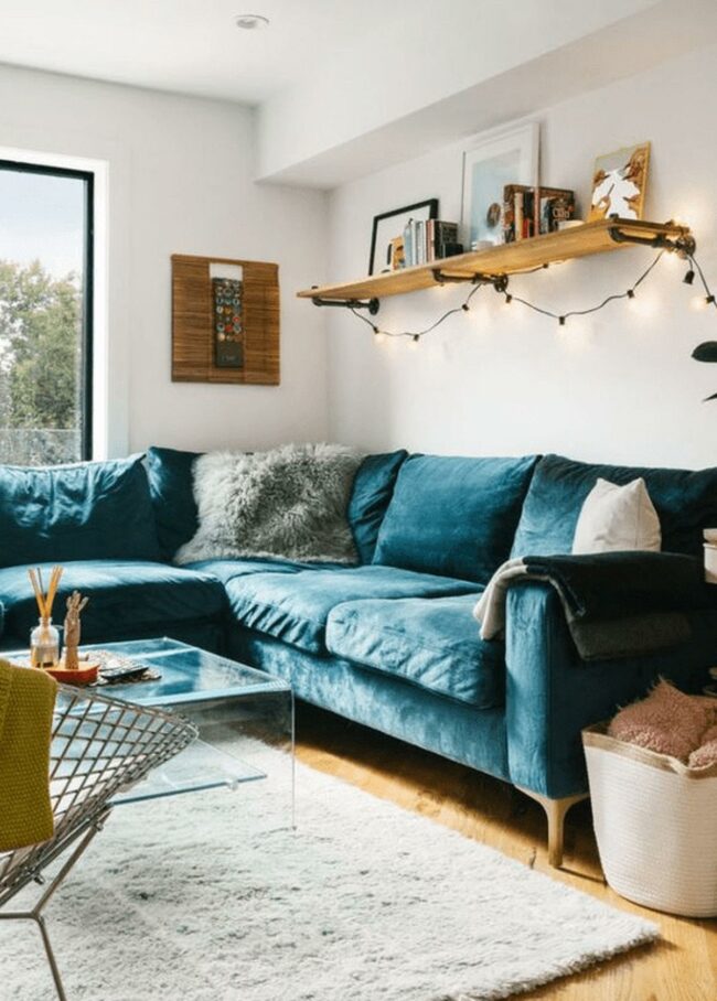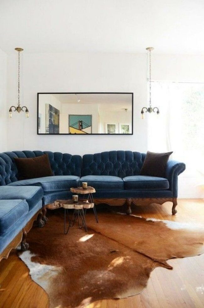 Living rooms with deep blue velvet couches are luxurious statement pieces that instantly draw attention.