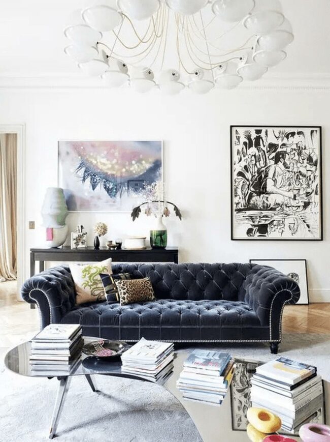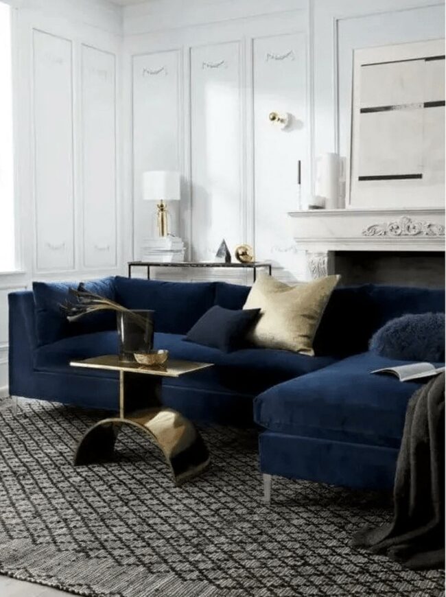 Dark blue velvet sofas become stunning focal points that invite relaxation and visual drama.