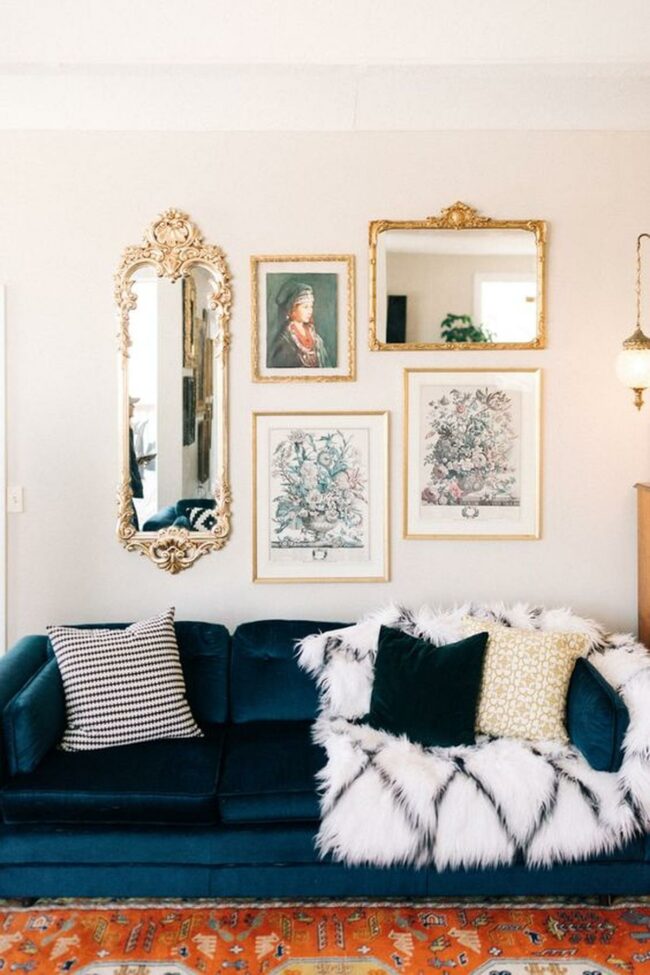 Gold-framed art pieces, including an ornate mirror and floral prints, elevate the wall's visual interest.
