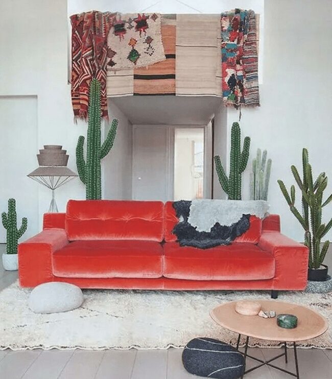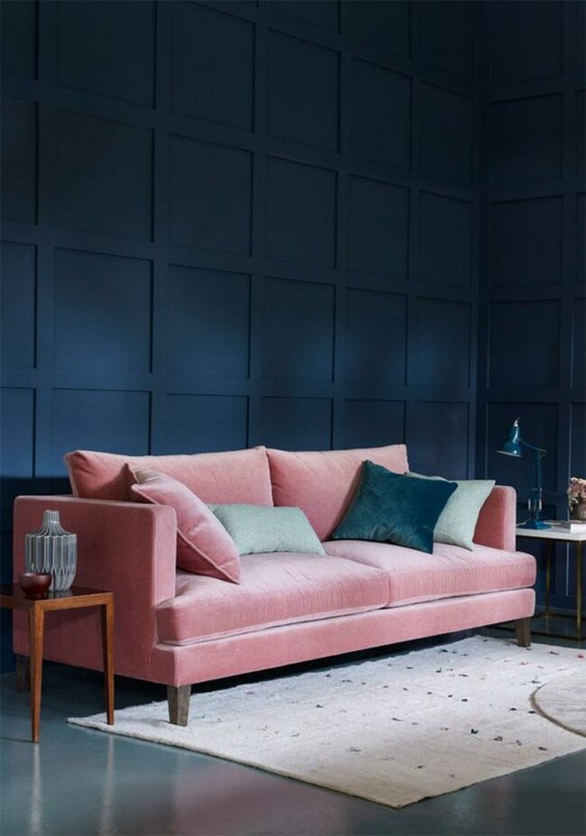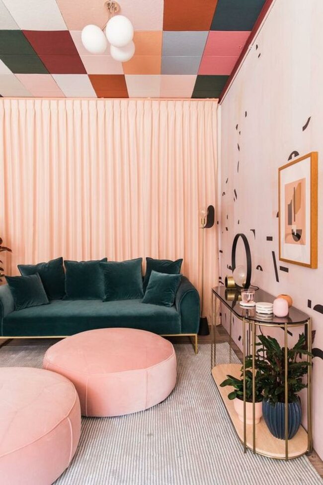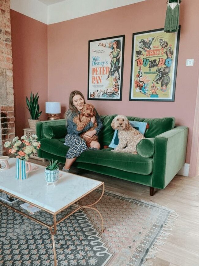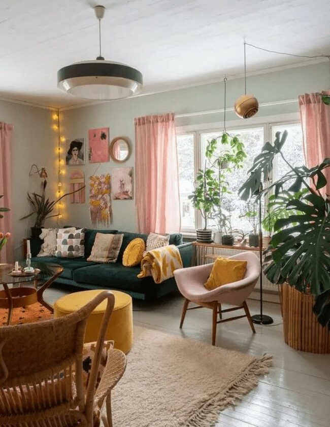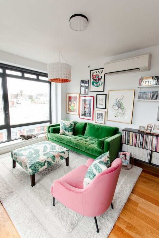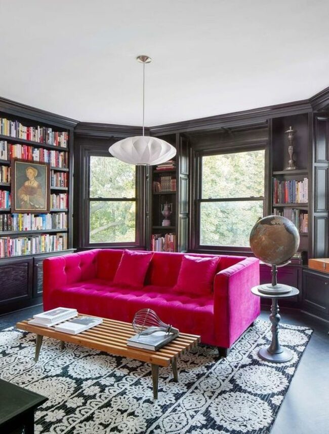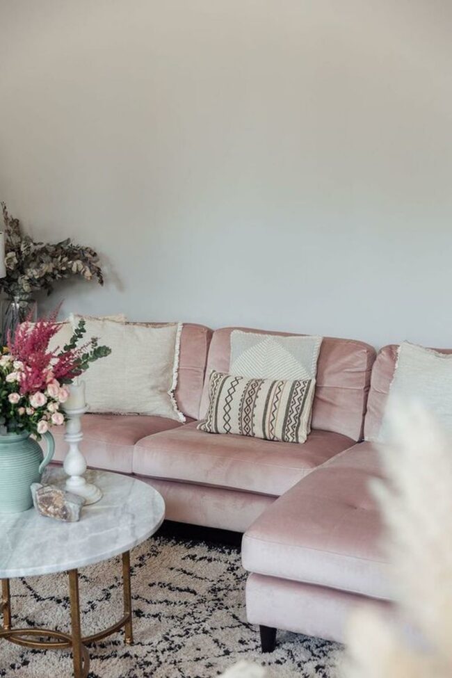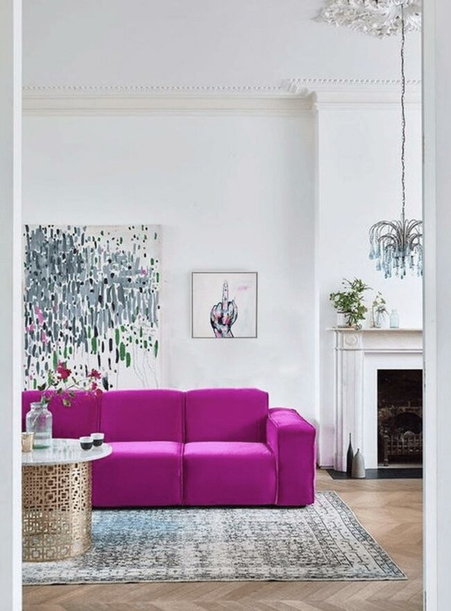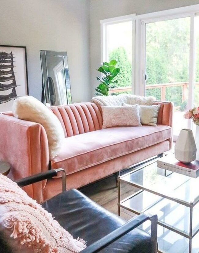 Living rooms spark joy with bold design choices like this pink sofa that instantly commands attention.