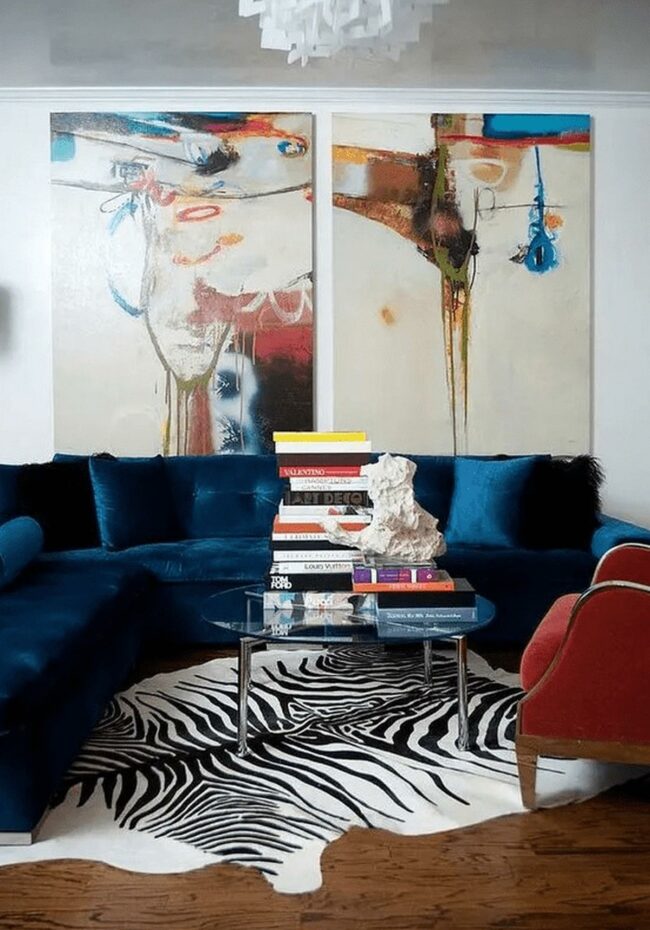 Black-and-white cowhide rugs introduce rich texture against smooth tile floors.