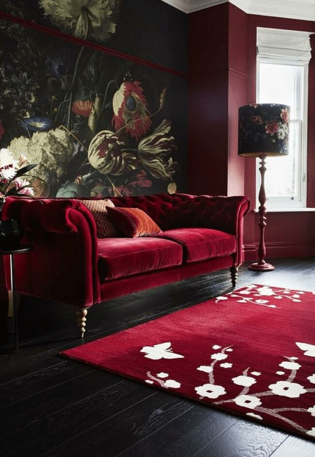 Dark walls intensify the vibrant red, creating dramatic contrast.