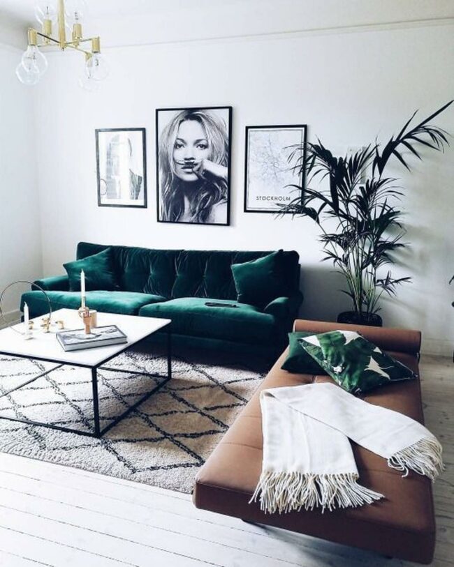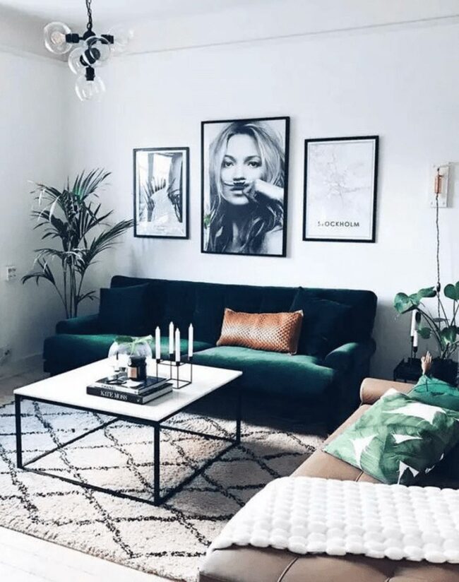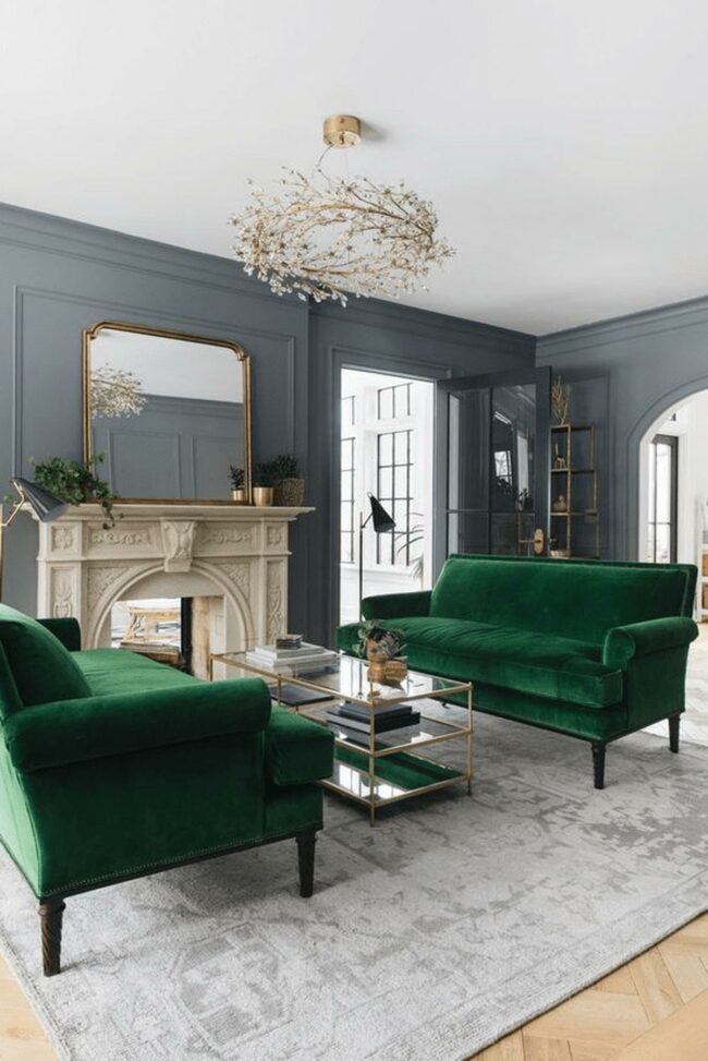Green velvet sofas command attention with their luxurious texture and bold color statement.