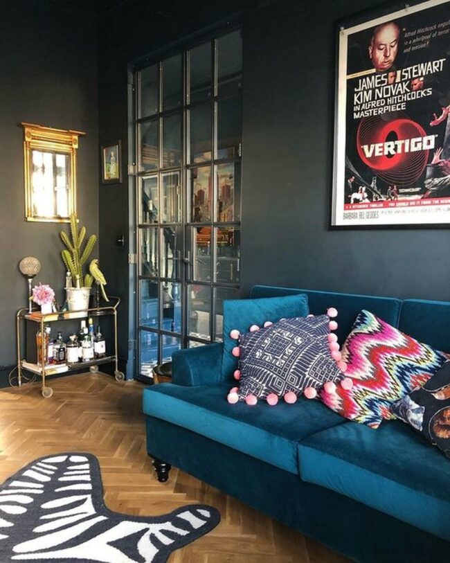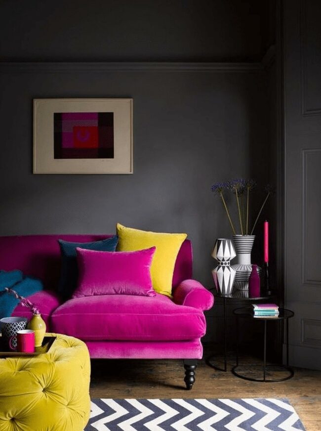 Dark gray walls are the perfect canvas for a vibrant living room bursting with personality.