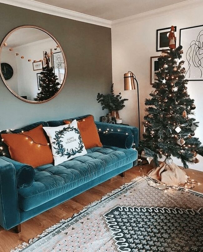 Thoughtful accessories like green wreaths and glass candle holders add layers of welcoming charm.
