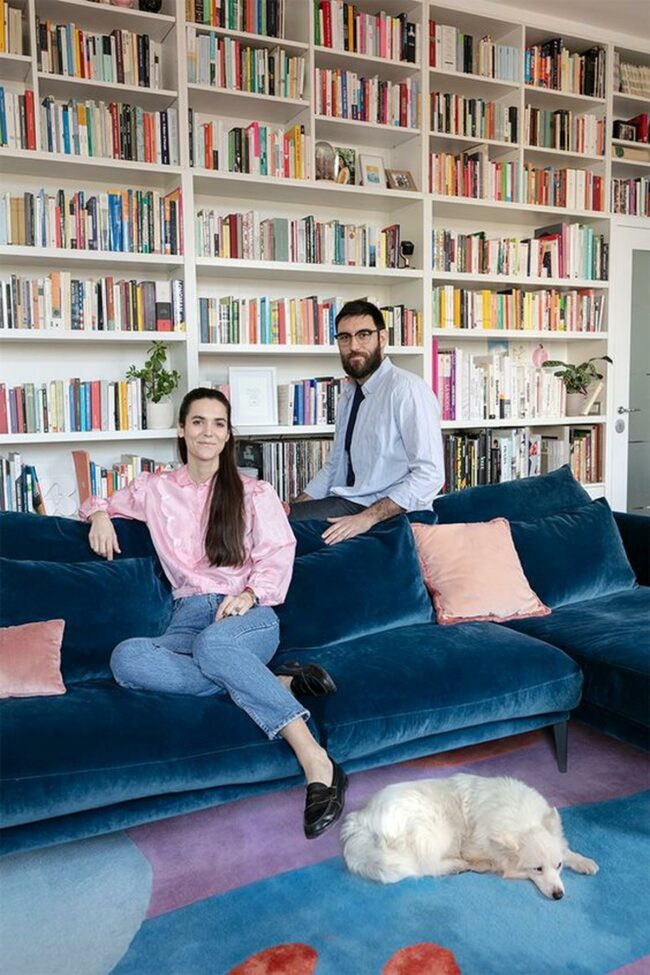 Black console tables behind the sofa showcase carefully selected decorative objects that complete the design narrative.