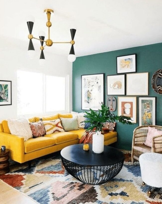 Gold-framed artwork adds personality and visual interest to the walls, completing this vibrant and welcoming space.
