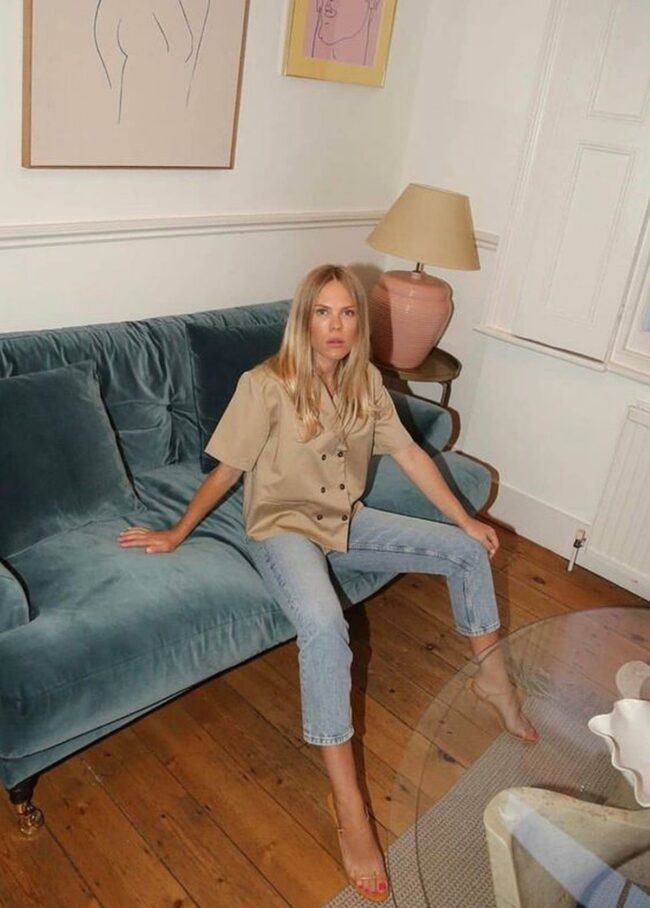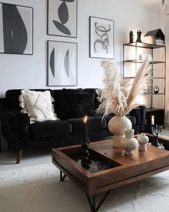 Black coffee tables hold carefully selected books and candles, enhancing the calm atmosphere.