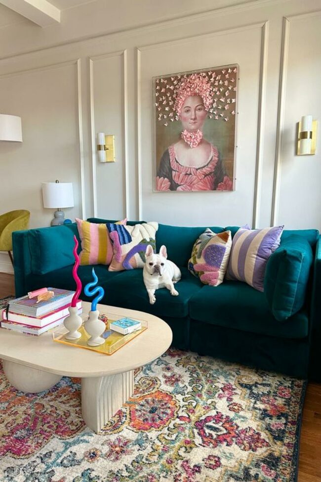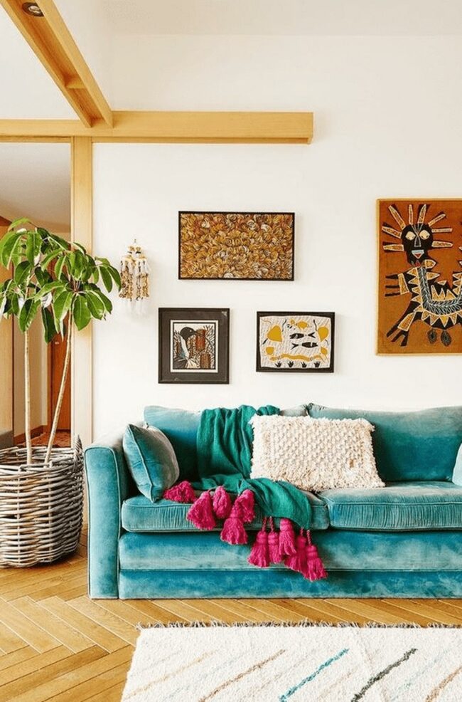 A plush teal couch becomes the focal point, adorned with colorful pillows and a playful green throw blanket sporting bold pink tassels.