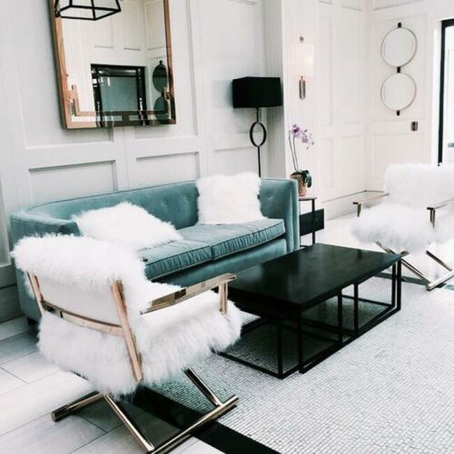Fluffy white throws with black stripes introduce delightful texture to the seating area.