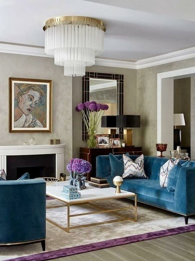 Deep blue velvet sofas and a matching armchair anchor the room with rich, luxurious texture.