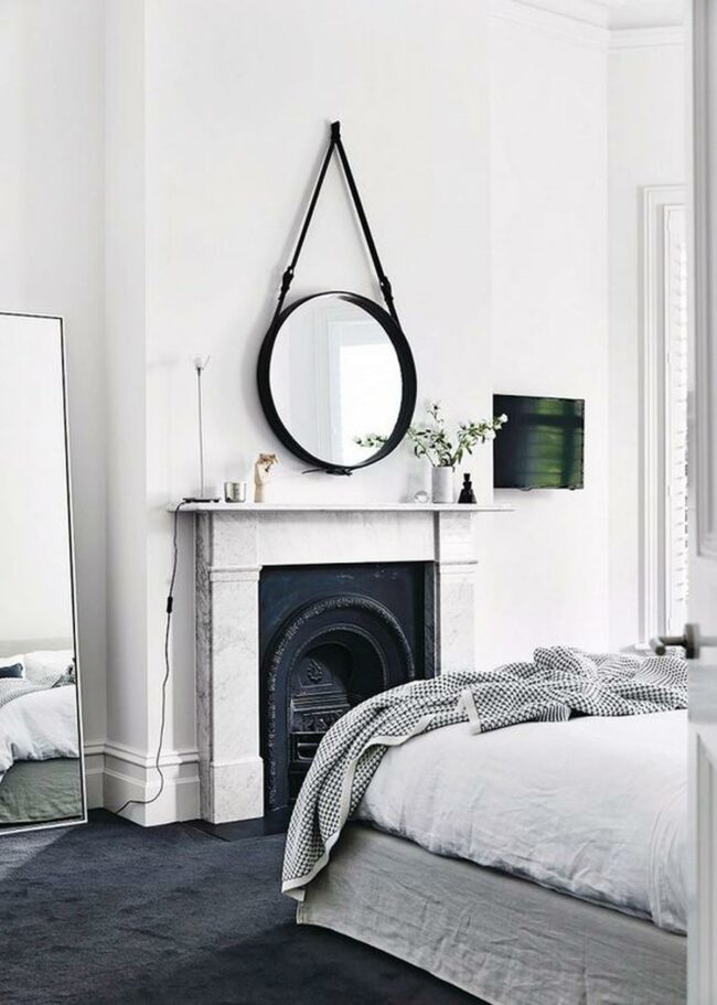 Classic fireplace details include a round mirror hanging above, adding architectural interest and visual depth.