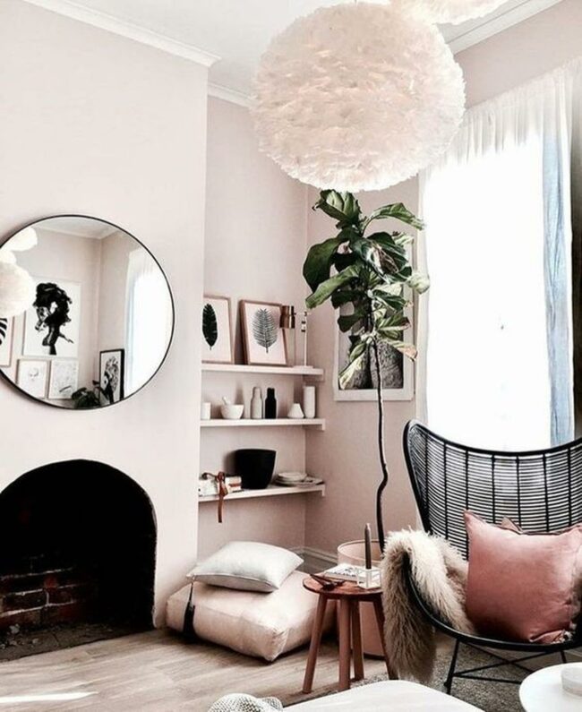 Tall floor mirror placement against one wall creates an illusion of expanded space and dimension.