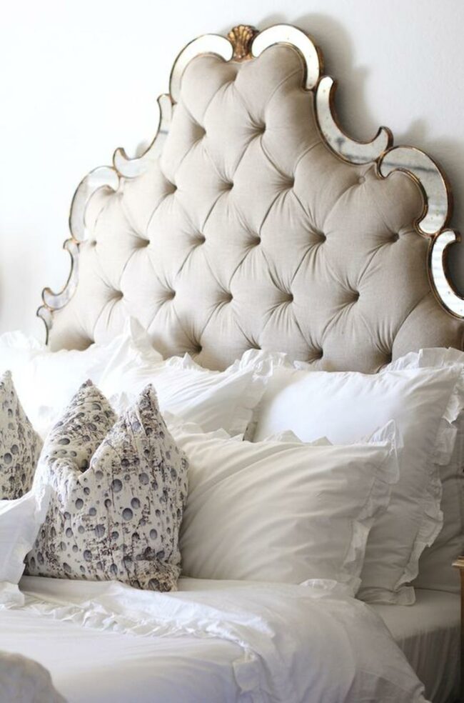 Bedroom spaces sparkle with sophisticated charm through a grand, tufted headboard boasting luxurious gold trim.