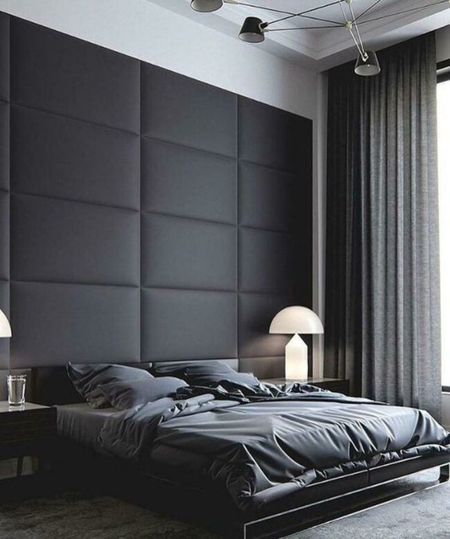 Padded wall panels behind the bed create a dramatic backdrop with deep gray tones that establish a calm atmosphere.