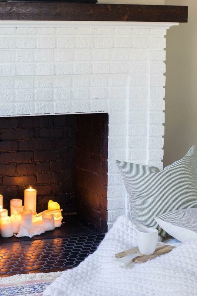 Lit candles inside the fireplace cast a warm, flickering glow that enhances the room's calm atmosphere.
