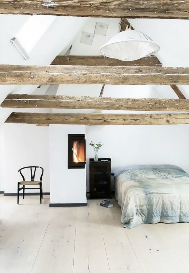 Wood beams stretch across the ceiling, infusing the room with authentic charm and character.