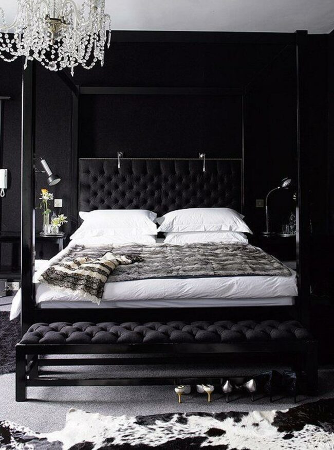 Dark walls and furniture combine to craft a dramatic atmosphere that commands attention.