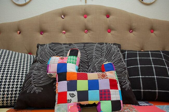 Patchwork dog pillow creates a fun and playful bedroom atmosphere that instantly catches your eye.
