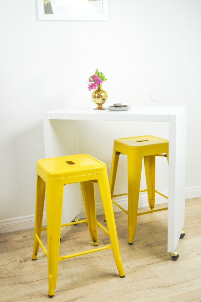 Yellow metal stools pop against a crisp white table, instantly drawing your eye with their playful color.