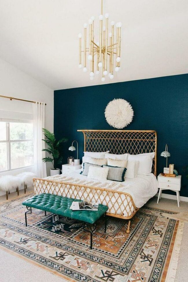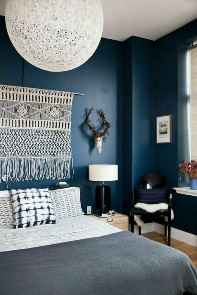 Blue walls dominate this bedroom's stunning design, creating an inviting atmosphere that feels both relaxing and energetic.