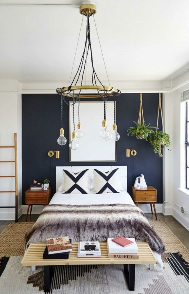 Navy walls in this bedroom are the dramatic backdrop that instantly elevates the entire space.