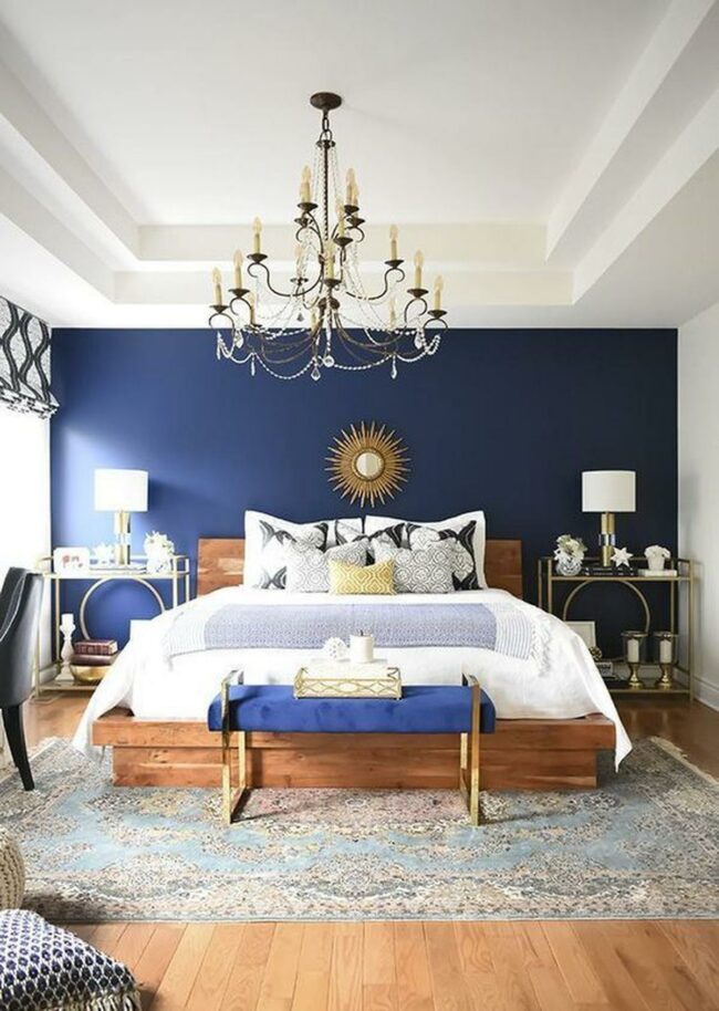 Bedrooms with deep blue walls and intricate molding are stunning visual statements that immediately draw attention.