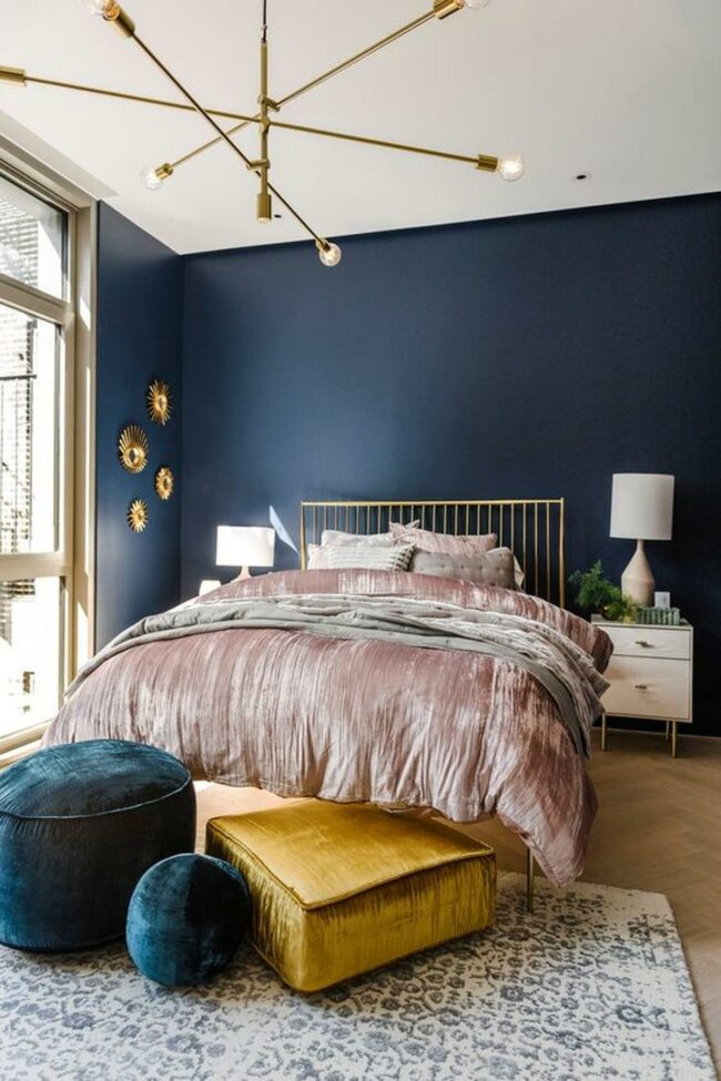 Gold metal bed frames sparkle against deep navy backdrops, instantly elevating the room's aesthetic.