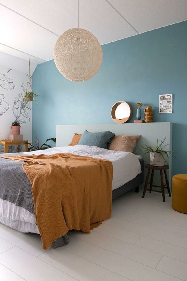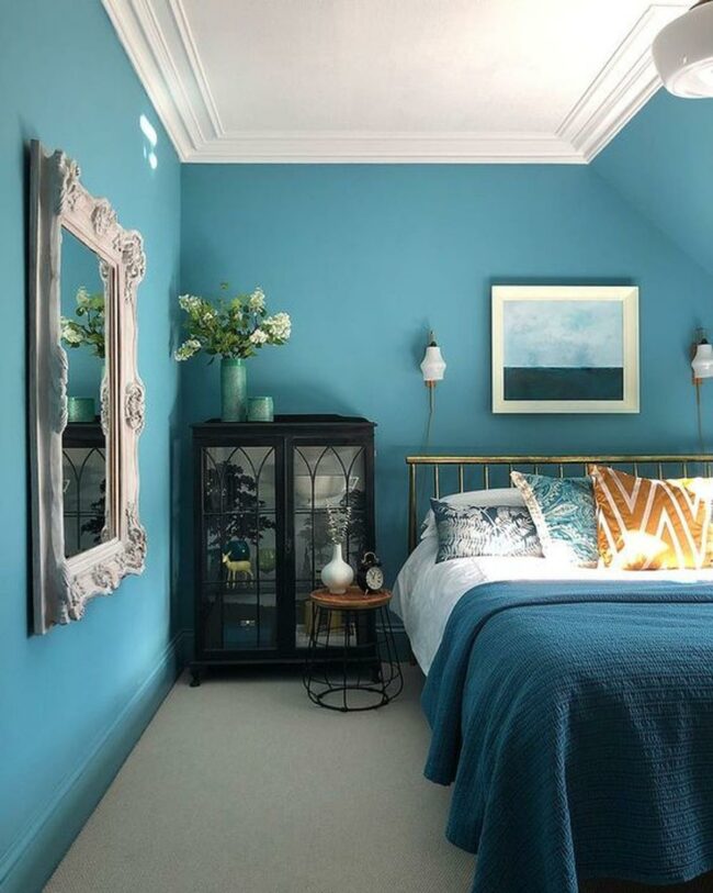 Blue walls dominate this bedroom, offering instant tranquility and setting a serene mood.