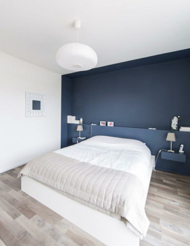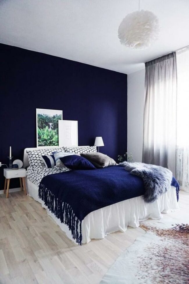 White bedding pops against the deep blue, creating a striking visual contrast.