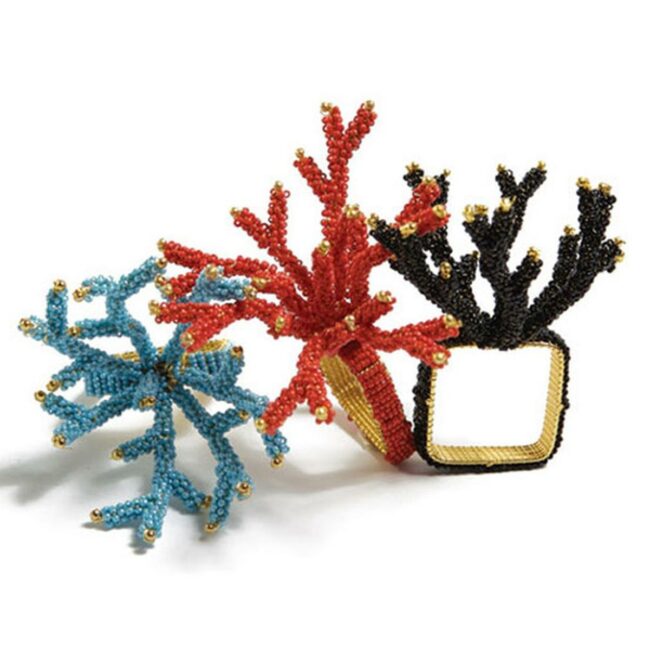 Stunning coral-inspired rings dazzle with bold red, blue, and black patterns that instantly catch everyone's eye.
