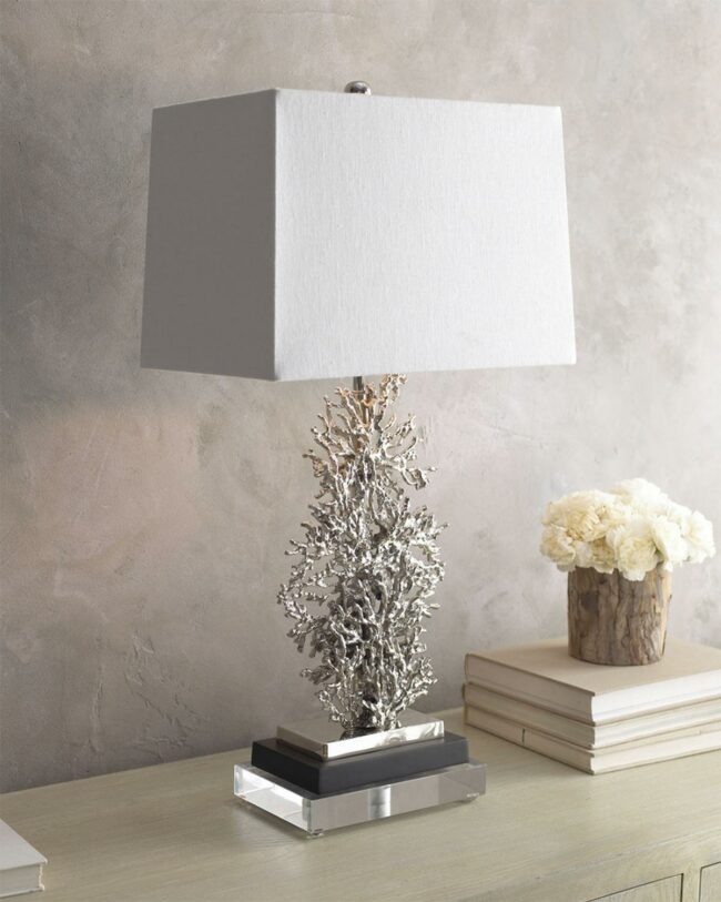 Soft natural light fills this peaceful room where a striking silver coral lamp becomes the star of the show.