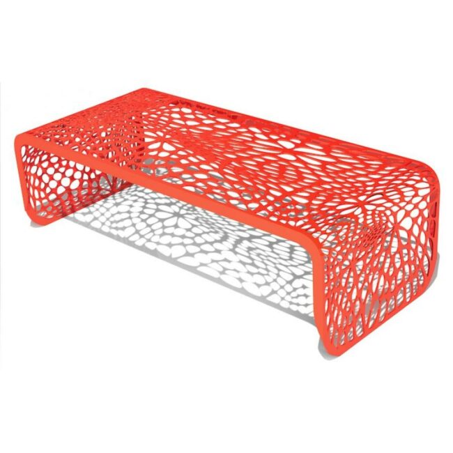 Red bench designs with intricate lace-like patterns catch everyone's attention in outdoor spaces while creating beautiful shadow patterns when the sun shines through.